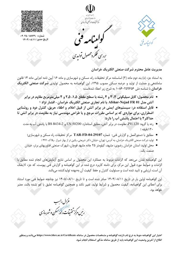 به استناد جزء (ه) بند دوم ماده (۲) اساسنامه مرکز تحقیقات راه، مسکن و شهرسازی و ماده ۱۶ آییننامه اجرایی ماده ۱۴ قانون ساماندهی و حمایت از تولید و عرضه مسکن مصوب ۱۳۹۵، این گواهینامه به محصول کابل سیلیکونی ۲، ۳ و ۴ رشته با سطح مقطع ۱.۵، ۲.۵ و ۴ میلیمتر مربع مقاوم در برابر آتش مدل Afshar-Nejad FR 01 با نام تجاری صنعتی الکتریک خراسان - افشارنژاد به شناسه ملی ۱۰۸۶۰۲۵۹۶۵۶ اعطا شده است.